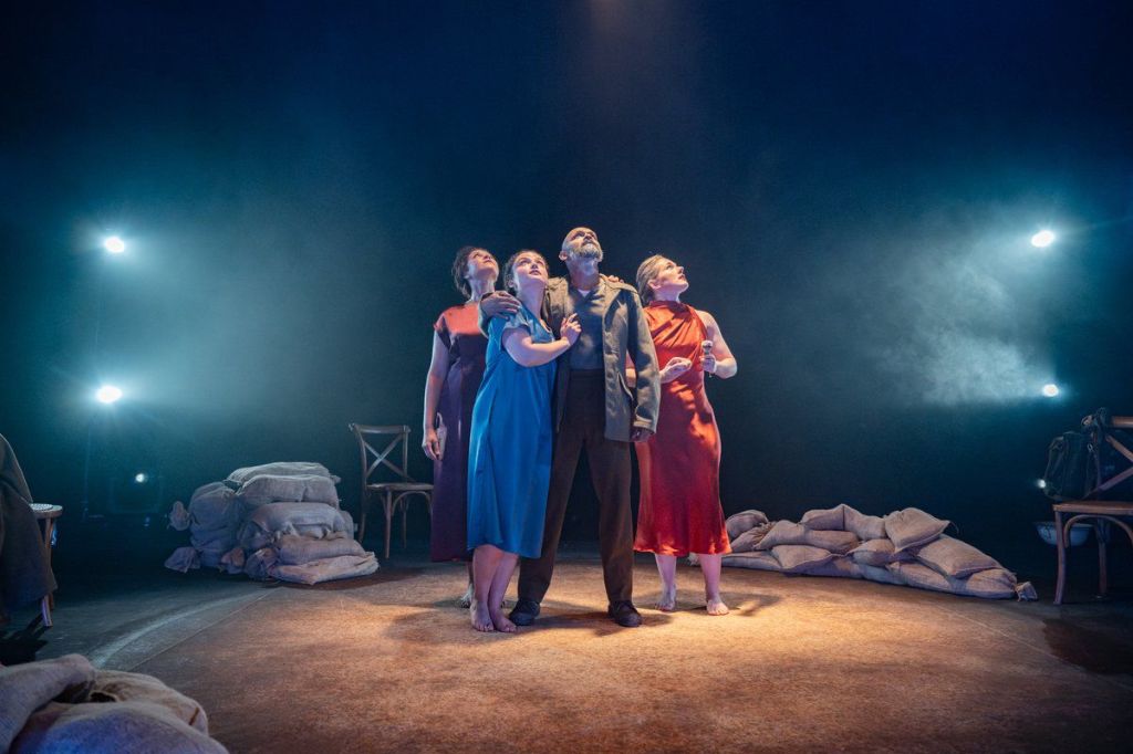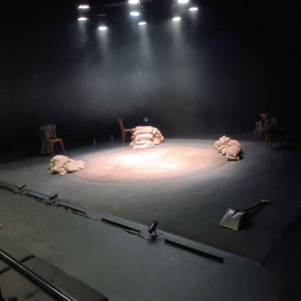 But it is not poor theatre exactly, just a nearly empty space but for three simple chairs, perhaps from a ‘sixties’ dining suite, and three substantial piles of what we imagine to be sandbags, given the yellowish hue cast around them. When the stage darkens, there are sounds variously of storm and war, a plume of thick smoke, like the Bristol of a dragon [‘Come not between the dragon snd his wrath’ sounds in my memory from the play] seems to belch from behind one of the piles of bags. And smoke and lighting effects as strong as those in ths play can not be called elements of ‘poor’ theatre, iather for they emphasise the very illusions that make theatre a rich experience.