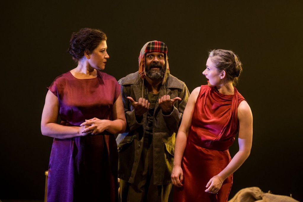 And here I think the analogy of Lear and the King of the same name has its end and we need to insist that it is positively unhelpful to see this Lear as a version of King Lear, for it shares only some parts of the story in a sequence often at ends with the older play, although using the play as a source frankly of telling stereotypes, of male authority, madness, the idea of the fool and of family dynamics, especially that between sisters where fathers play an unquestionably dominant role, at least in theory, it tells an entirely different story and nuances the characters. For instance. The older daughter in violet, to people who know the play, holds the apparently imperious characteristics of Goneril, the daughter in scarlet the wiles of Regan and the daughter in sky-blue the resilient refusal to fold to her father’s nonsense whilst loving him ‘best’ of Cordelia. But this play is not a straightforward retelling, nor are the characters modern versions of Shakespeare’s. Whilst admiring Shakespeare’s play more than any other, there is no doubt that is extremely misogynistic and that one tool of its misogyny, taken to the extremes in Lear’s madness, is the unbearable bifurcation of the trio of sisters into two, both bad – if in their own way – and one perfect daughter, too good to live, but even as she is thought to live by her father whist stone dead, subject to male superiority of presence, and even of voice: