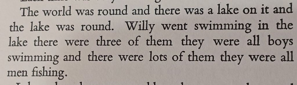 Why, when, and where personal identity and sex/gender status is marked in a person remain profound questions of our time, despite J.K. Rowling’s attempts to powerfully impose her view of things on all this with simplistic binaries. It is only a paragraph or so after this song that ‘a cousin named Willy’ is introduced, who though ‘almost drowned’ twice, seems to enjoy male power as his entitled context, for it is as expected to know that the lake we see him swimming in with other boys and surrounded only by ‘men fishing’ is ’round’ as we assert that the ‘world is round’. Male entitlement seems as natural as that. Men face dangers but save each other – Stein therefore enjoys the assonance between ’round’ and ‘drowned’: the assumed fact of the former ensures the contact between males that stops each other drowning: ‘And so Willy was not drowned although the lake and the world were both all round’. Surrounding danger is ‘a round / around’ shape nevertheless [2]: