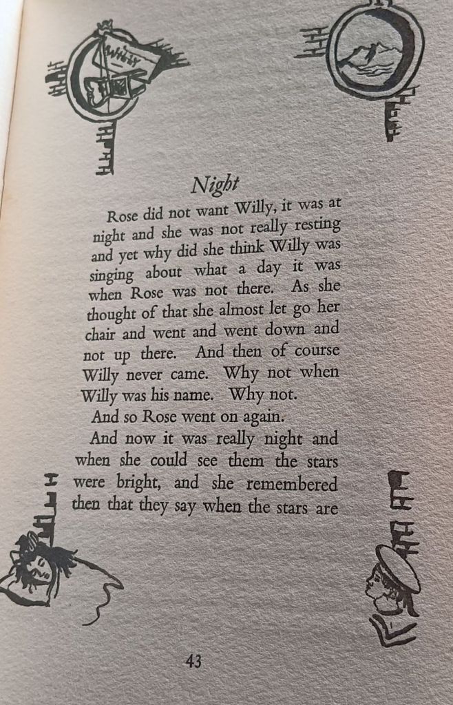One chapter – Rose Does Something – certainly seems to give a key to Stein’s interest in gendered language and how radical ideas might be expressed. See below its opening in the USA edition.