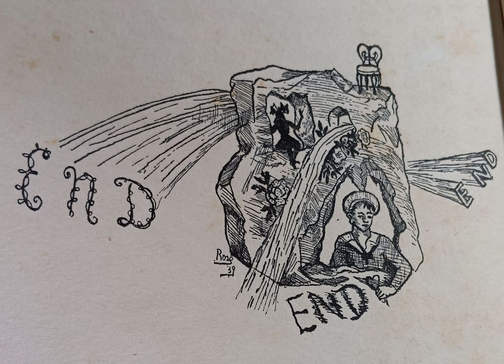 Willy, who in the book is most often represented as a sailor, appears as merman, gazing up at the picture of the character Rose on the page before. His head bears a cap, like a sailor’s cap, with his name on its head band – the name in bold font – written just in front of the point where the headband decides to play games, morphing behind him into repeated and proliferating swirls that create a shape that rhymes with the butterfly-shaped bow worn in Rose’s hair. I wondered why Rose herself did not have a name label, though doing so forced me to see the repetitions across the pages of the artist’s signature – simply using the name ‘Rose’ or ‘Rose 39’ to indicate the year of completion of the artwork.