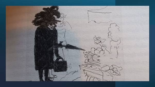 And it is that historical contingency that today makes me honour the way Wade creates a model for the biography of queer love. Because at the ‘heart’ (in both senses of the word – even its non-Steinian ’emotional association’) Wade’s biography hinges in its two parts on the manner in which Stein’s linguistic innovations mirrored the need to rethink the very negative associations of romance with heteronormativity. I tried to address this in an earlier blog on The World Is Round (see it at this link). The evasion of heteronormativity in that story may even be deeper than I recognised and certainly reading Wade helps you see that it is not entirely fanciful to see the connection of Sir Francis Rose, in his youth, with these two lesbian mentors as a spur to his creativity. Even after Stein’s death, Rose feted the boldness (to the point of embarrassment) of Toklas in 1960 as a domestic goddess. Note the cartoon below, entitled “Mlle Toklas fait le marché rue Christine‘: Everyone else fades in relation to Toklas, even himself, whom I take to be the young man behind her laughing embarassedly at Toklas pointing imperiously at the young girl’s melons.