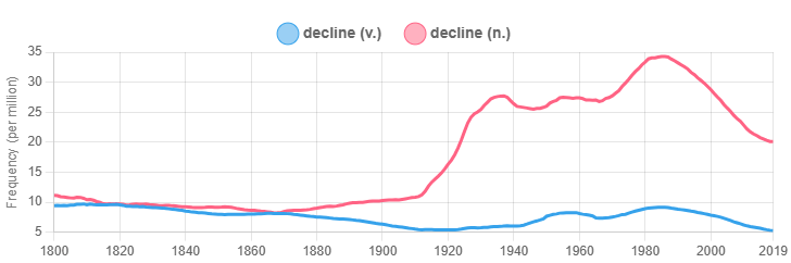 Of course, Wade is correct to say the phrase, ‘Can you decline history’ refers to the act of declension, the way grammars inflect nouns in relation to their use in the syntax of a sentence. But Stein never uses a word without full awareness of its multiple potential meanings, and the verb ‘to decline’ has varied meanings. The thin evidence from Google ngrams about its usage suggests that it also response to sociopolitical trends, rising in frequency as a noun from the end of the nineteenth century as perhaps a response made by societies aware of increasing pace of social change (social democracy for instance in both class and sex/gender terms), and its tendency to interpret its response as the fear of a fall in social standards. As a verb, it never reaches usage levels, though apparently more in use in the twentieth-century.