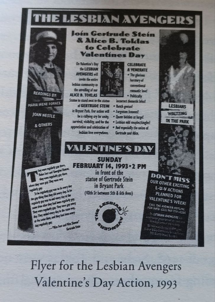 Almost simultaneously I began to see Stein at the same time not as a far-right collaborator but a queer ally, her cause taken up across the LGBT movements of which I was part. Wade reminds me of that moment in ways that touch me deeply: talking of activist energy, which, though largely in the USA, was reflected in London gay liberation thinking and in the heady alliances between feminist, lesbian and gay male movements towards a shared end. She writes of the Lesbian Avengers Valentine’s Day event of 1993, which I remember by report, as if the Stein/ Toklas relationship totally supported Gay Liberation’s attempt to renew romantic models of relationship in queer terms. Using this lesbian couple as its masthead as well as the problematic idea of that being between a ‘butch genius’ and a ‘forgotten femme’, they held them up to an audience tjey had never previously had in public [7]