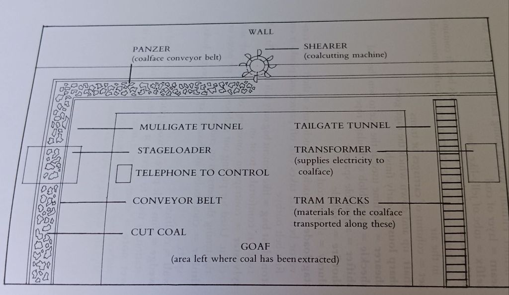 On the other hand, I do value this labelled diagram from it. It and the book’s glossary is one of the clearest explanations of the terminology of Northern mining I gave read, and indeed the book glories in it, demanding that a reader makes themselves proficient in this alien vocabulary.: of goaf, panzer and the directions used in pits, and in Tom McGuinness painting titles, inbye and outbye.