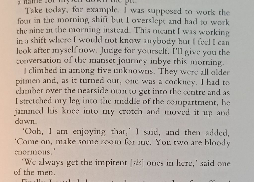 Kit describes the miners he sees as bigger, more energetic and stronger than he – indeed the joke even the men make, with its eye on the constant conversations about sex with ‘a lass’ , is of their potency. A potency he lacks. The following passage with its sexual play even takes that a stage further, although with no hint that the play carried any intention of desire – it is, as it reads merely a comparison of big strong manual masculinity against over-mindful self-conscious bourgeois failure as a ‘man’ that is feminised and or removed from male status, in the body at least. It is a passage about how Kit has learned to deal even with men he does not know: