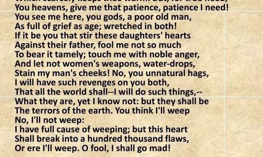 For Lear, the issue hangs around the failure of his role as KING and FATHER being considered enough to justify his leisure, luxury and excess – without need to prove his worth. Even in the sixteenth and seventeenth-century however, the notion of self-value as thing one had to work to achieve, whatever your class, was already becoming established – if in its infancy in plays like Shakespeare’s The Merchant of Venice. Women have, though, this experience and continued to have Lear’s misogynistic objections to them used to reduce their worth in their own eyes and that of society. Women had no right to ‘noble anger’, and their tears were seen as inadequate forms of power-grabbing – weapons that ought not to work.