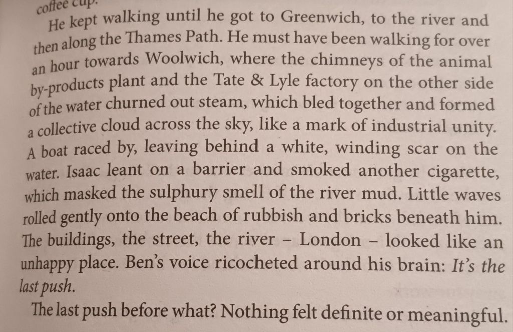 The ‘last push’ is clearly a crucial concept in the notion of the bildungsroman even if never, to my knowledge at least, used before. Whatever Isaac’s confusion here about what Ben might have meant by it – and some of the meanings are clearly wishful or magical thinking about being taken sexually by his romance hero – Ben’s probable meaning must have been crystal clear. As school approaches its end, pupils will need that last energetic push to launch their futures. But Ben thinks about this term in the context of a waste land akin to T.S. Eliot’s. any effort leads to a future dominated by a ‘collective cloud’ of ‘industrial unity’, where manufactured sweetness ‘bleeds’ into the killing of exploited lives – animal or otherwise. Dominated by experience that hurts or scars the future is ‘an unhappy place’. The ‘purgatorial’ context may in part explain the way in which industrial effluent is best described in ‘sulphury mud’. My own bet is that all of this association is a product of the fact that passage is from the point of view of Isaac himself,. left behind in the purpose of God the Father (or Abraham). The future may lie behind the ‘last push’ but that the future is indefinite or less than meaningful is totally unsatisfactory to Isaac, and that to an extent is a problem for us all : ‘The last push before what? Nothing felt definite or meaningful’.