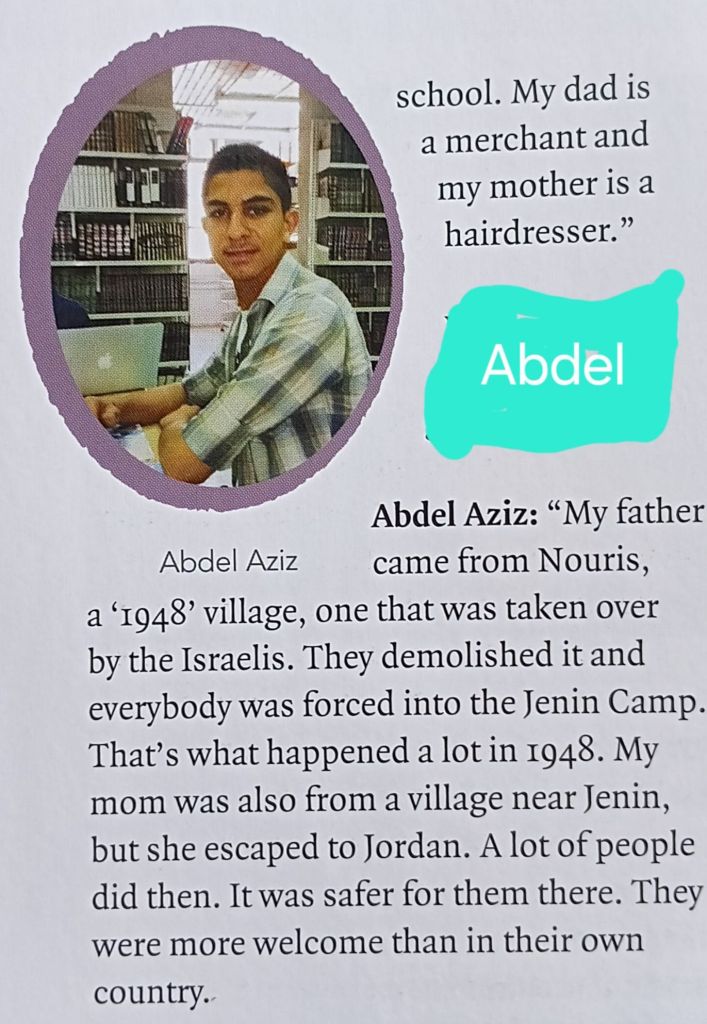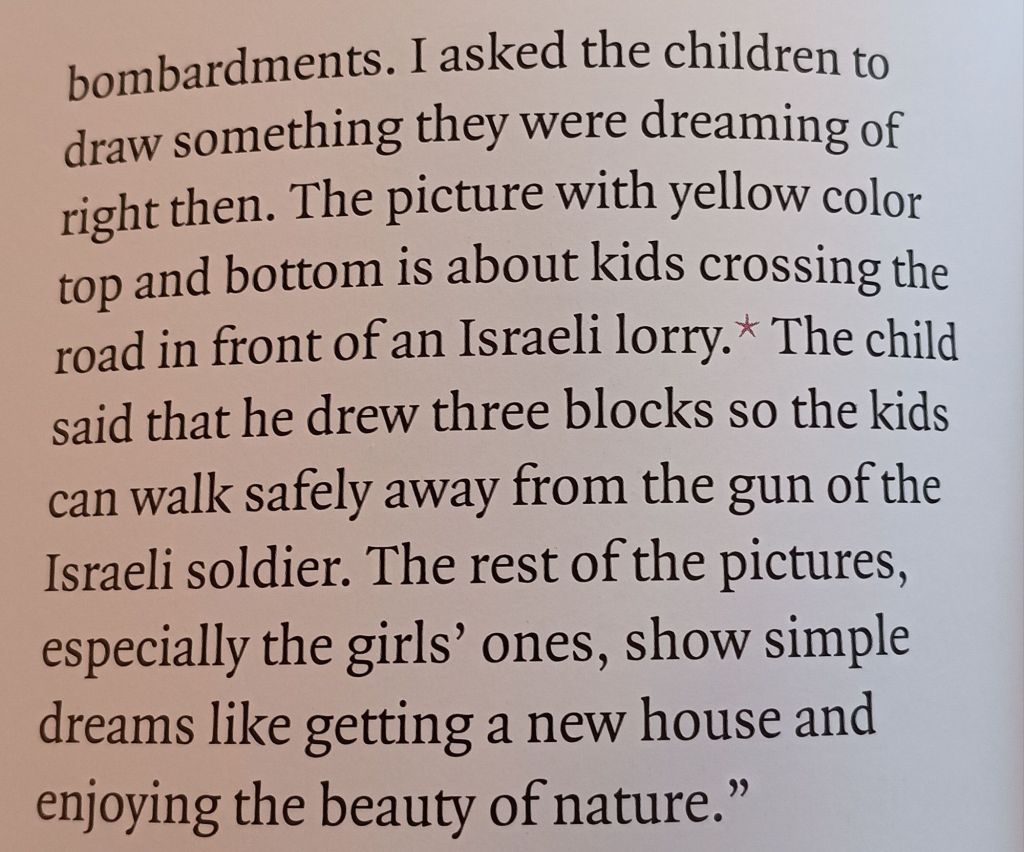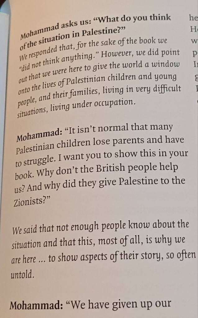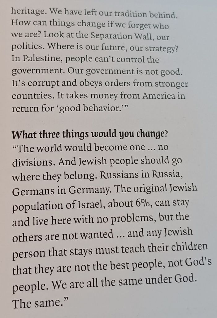 And if you listen to these voices, though there is accumulated hate for the occupier in some, whose history of eviction and limited rights, or of the death or imprisonment of family members is high, there is also a desire for a non-sectarian future and some criticism and a need for ‘better leadership’ or of arenas in which: ‘We are fighting ourselves’. [6] This book was finished before the worst of the Gaza genocide but even then it was clear that hope for change – in brief a ‘future’ – was not one these children looked towards. Futures depend on some security experienced in the past but listen to Abel Aziz, who is 16. [7]