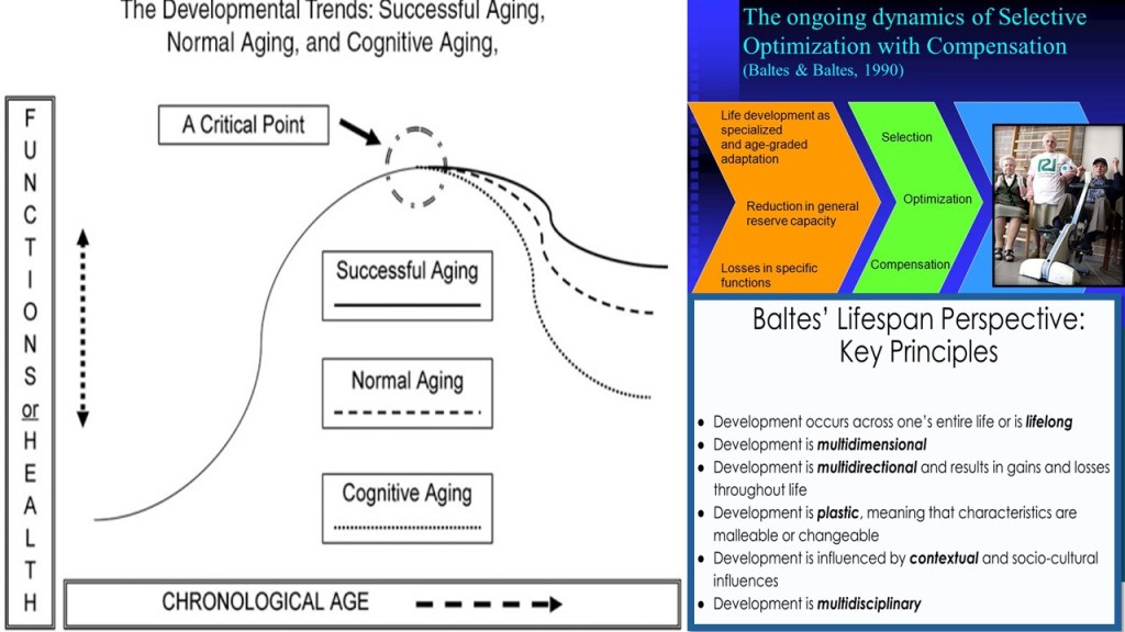 This couple whose own work in the Berlin Institute of Ageing, extended well into their own older age, spent a lot of time working to qualify universal beliefs in scientists of ageing in the implacability of the inverted U, which presents later old age only in terms of decline. However, they achieved only a modification of our expectations of ageing into a skewed U, as in the collage below. Their study of the strategies of aging people, applied to the whole network of biopsychosocial domains of the lived life of elders, and surprisingly, the Baltes found that by use of strategies of selection, optimisation, and compensation (really only wisely doing what you can become good enough at) that cognitive decline was still steeper than normal ageing as an average. However, successful ageing could buck both trends.