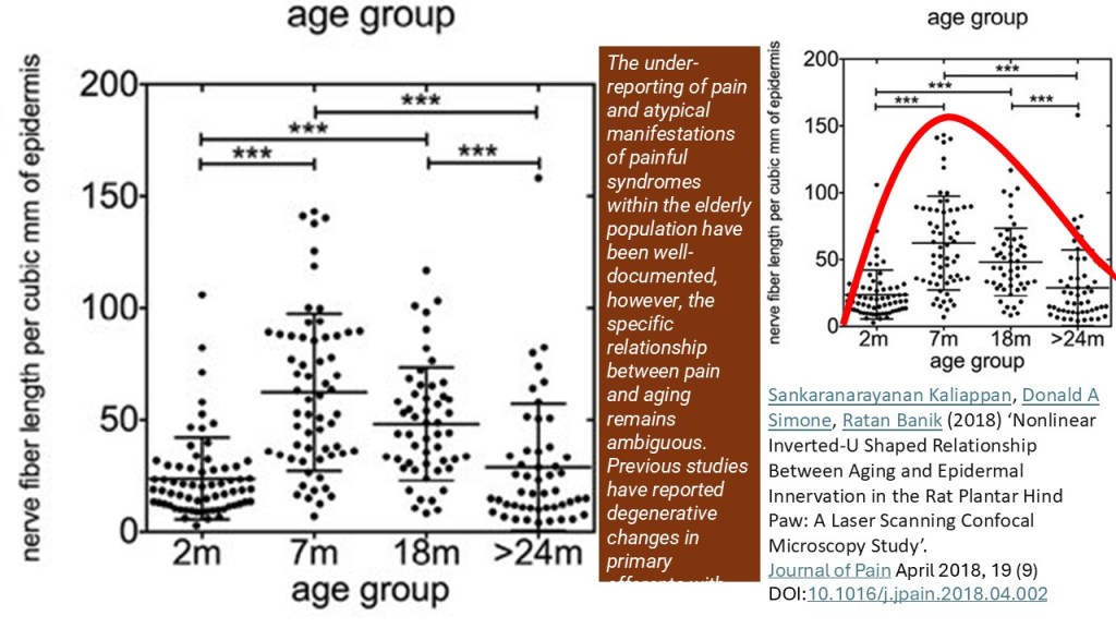 All associational or correlational studies try to generalise wide variance between individuals but even though such variance is seen in this scatter plot of correlations between the age group of rats and the length of nerve fibres, related to nervous activity in complex ways, in the skin of an area of their paws. But it is not hard to see that the relationship can be imagined as that of an inverted U shape, that of the red curve in the smaller occurrence of the graph.