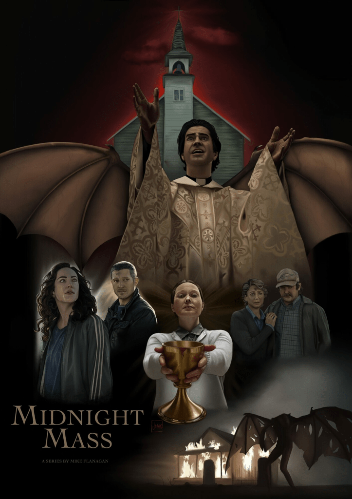 Last night, Geoff and I steeled ourselves to watch the final sessions of Midnight Mass on Netflix, another blockbuster event. I say ‘steeled’ ourselves but that was not because of , up to the final episodes, of any terror at the violence and gore in it, but it’s totally serious attempt to listen to conversations between persons on matters of significance. And that can get trying, especially when you are expecting a half-baked version of the Christian message, toned to the American Evangelical of all denominations. Let’s face it, Midnight Mass covers all the stops such messages require: the meaning of addiction to material substances, the values necessary to parenting, the duty of individuals to the community, and even of the relationship of particles to a physical mass. The latter, too, is near the knuckle of this series’ interest in the nature of social and ritual communion: the deeper meaning of Catholic Church Mass.
