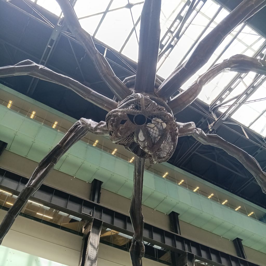 What I had not expected wasto enter the bag check at the huge entrance to the Turbine Hall at Tate Modern to see in front of me one of the huge metal Maman sculptures I have always longed to see in the flesh tha I have seen in photographs outside the museums of Europe. But there she was, standing on the bridge – too self-absorbed to wave a leg (at least one of the eight) at me: