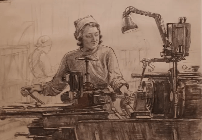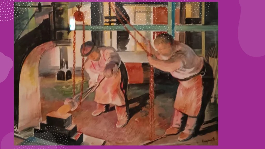 Reading this do you feel as I do that you want to say: slow down a minute and tell me exactly what the art you want to show me ‘represents’ in ‘paintings, drawings, and prints’. For ‘craft’ is a loaded word and not everyone will identify what we are asked to recognise in this exhibition as ‘craft’; as is somewhat given away by its contrast with ‘the atmosphere and activity of the workshop and factory’. Factories when I was younger never piped music to workers because of the probiting noise of the machines – I am thinking of the textile factories of West Yorkshire then, far too noisy to hear anything above them and hearing problems in later age were common in mill workers – my mother worked in a quieter area – in the spinning room but the noise of even industrial yarn spinning was still deafening to my young ears and finished my grandmother’shearing permanently: