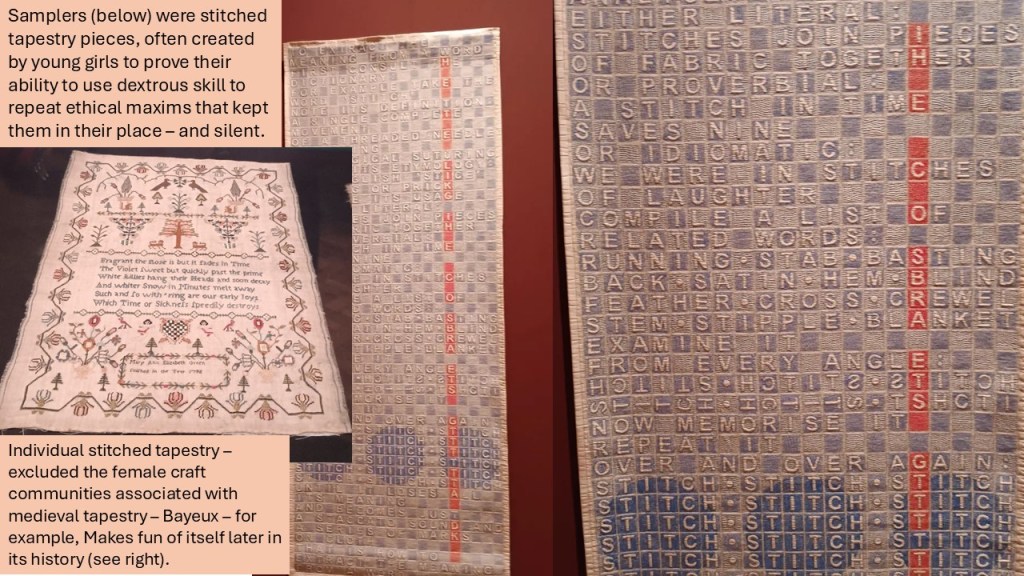 Whether such work or craft was ever allowed to pass as ‘art’ of the higher order established in male traditions of evaluation is uncertain. The eighteenth century example in the exhibition shows a great lady sewing in the company of men engaged in music, the most iconic of arts. But does companionship of arts also intend to show equality of them? I think not. . I think that everything, even the slant of her work table, marginalises the import of the lady’s contribution. What do you think?