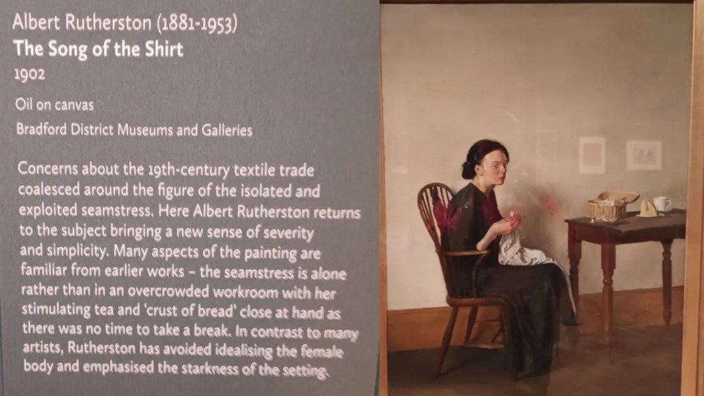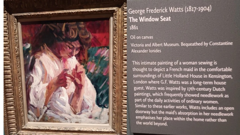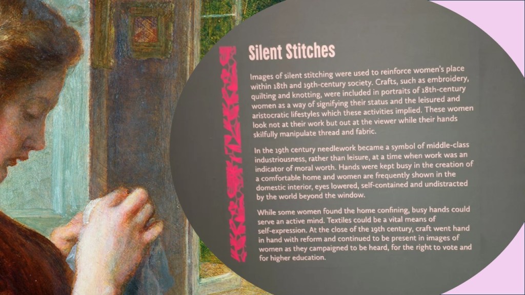 This takes us back to Room 1 and to the arguments there about how female behaviours were sometimes symbolised by the requirements of individual handcraft. Solitary silent stitching, the curators tell us, encapsulated a theory of female passivity with any dangerous activity in women absorbed in silent bonding together of things – stitching things together.