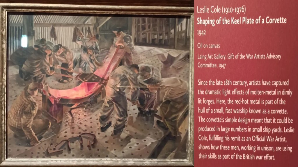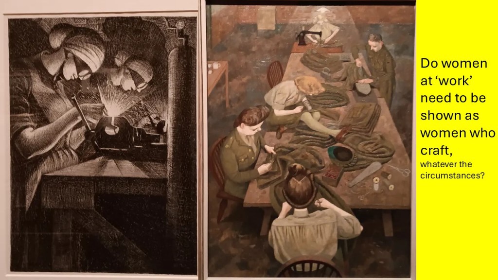 Among the most interesting pieces in this exhibition are war artists representations of women (see an earlier blog on a Laura Knight exhibition, amongst other twentieth century women artists) at the Laing at this link). Below, are examples of war work where women, as their subjects, are treated as being as as serious workers as men, and engaged communally in work and craft – and not least in art representing them. In the collage, the piece on the left is by the fabulous artist, Christopher Nevinson – but the exhibition makes it clear that even this male painter probably exploits stereotypes of women as craftswomen, even though pictured in welding. These women could be sewing neatly and compactly. Whilst in the example on the right, whilst the women are working on military uniforms , the task is still sewing and the femininity of the subjects emphasised, even though the downward point of view removes from them any hint that they encouragement the gaze of others on them as sexual objects.