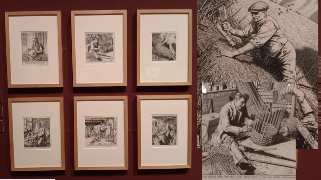 That individual male crafts mattered too was fuelled by this backward looking version of Englishness – which in Lucky Jim, Kingsley Amis saw as the reason for the longing in academics for a theme of a medieval Merrie England, always spelled thus, as a fantasy of being a medieval term itself. Some sketches of contempoary Merrie England male crafters existing into the twentieth-century illustrate the theme in Room 2:
