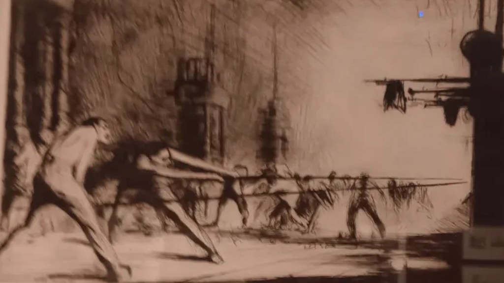 War artists were ready to extend this version even into idealised images of hand labour organised into the feel of a co-operating and participatory team craft, as below, almost as an image of the nation.
