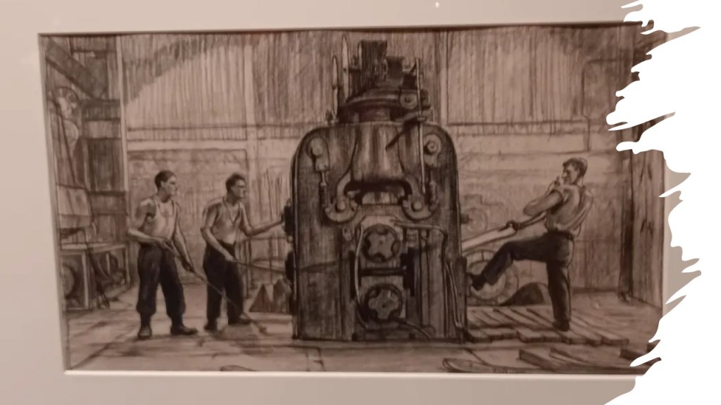 But can you hear the machine here [in the picture from the exhibition below] anymore than the stilled and empty factory above – or can the ‘machinist’ even hear it, or anything else except that special kind of silent music: “the still sad music of humanity”, as Wordsworth called it.