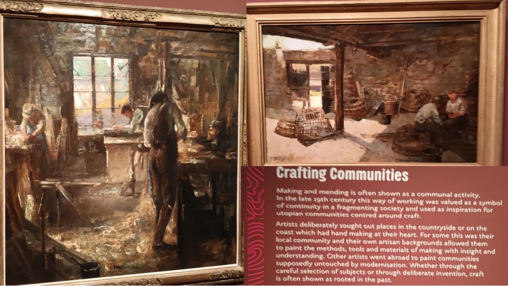 However, more frequently the idealisation of the craftsman (always a man) was in terms of an elegy for a world that was being lost; a stable society where the lower orders were contented (as it was used for instance by the Leavises (F.R & Q.D.) in literary criticism with their constant references, from 1923 at least, to George Sturt’s The Wheelwright’s Shop), taking evidence too from George Eliot. This is how this theme appears in the exhibition, although it is particularly noticeable how much this theme and its communities privileged men as ‘crafters’ in the beginning of Room 2 of the Exhibition (Room 1 being mainly about craft as a sex/gendered as well as class subject.