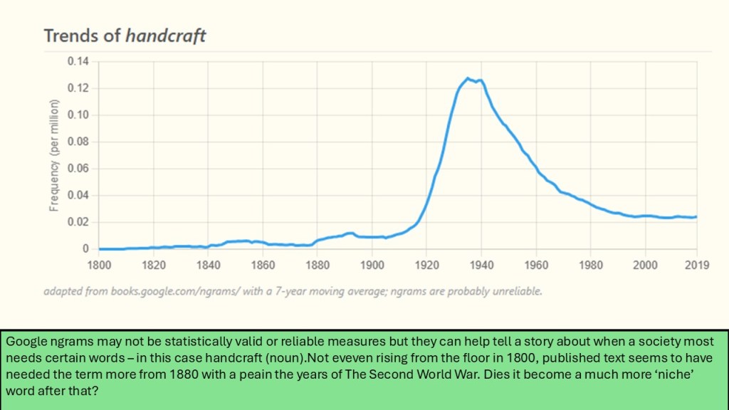 These are the issues which associated how one used the term ‘art’ or ‘craft’, as different or related terms, in the nineteenth century. Whilst the aesthetically centred (Walter Pater and Oscar Wilde for instance) separated art from lived practical life as much as possible, the new Social art movements of the late nineteenth century saw art and life brought together in communal needs. This theme was to be invoked well into the twentieth-century, as the ngram below perhaps evidences.