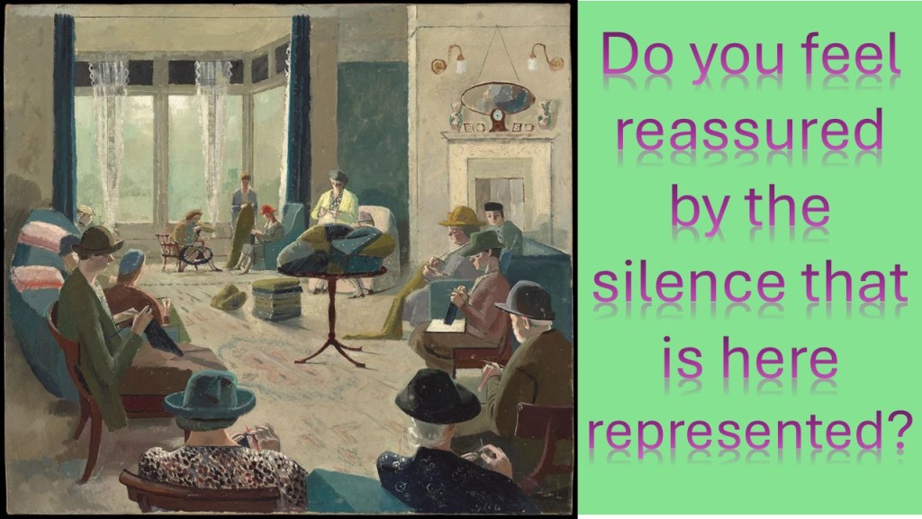 Looking at another painting – of women sewing for the benefit of the nation – I did not feel I could answer in the same way, for there is a deliberate way in which these ladies have clearly differentiated themselves from each other – collaborating perhaps, but only thinly. There is something terrifying about a picture in which most of the most visible characters have their backs to you and are not just ignoring your gaze but refusing it, and not only because they are concentrating as the sailmakers are but because they are locked into a kind of reserve they feel necessary to their self-esteem as women.Whether ‘craft’ or ‘work’, it is entirely individualised – none-communal even though superficially there is a community. Of course, my reading could arise from a kind of internalised misogyny and I think there is indeed an element of that in a society framed by patriarchal values.