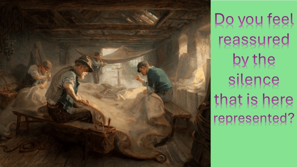 Male authority gave even working-class elders value in the eyes of the picture-buying bourgeoisie. And this authority is not to be frittered away by showing craft either in an individual or a group – merely passing time in the activity, and sweetening labour by listening to something that distracts them. See the question I pose in the collage below. If I were to answer it myself, I would say that the silence pictured – silence but not stillness for the hands of the men sewing sails seem to have some remnant of motion – is authoritative of a guarantee of the quality of the work done. It benefits from the oneness of the group.
