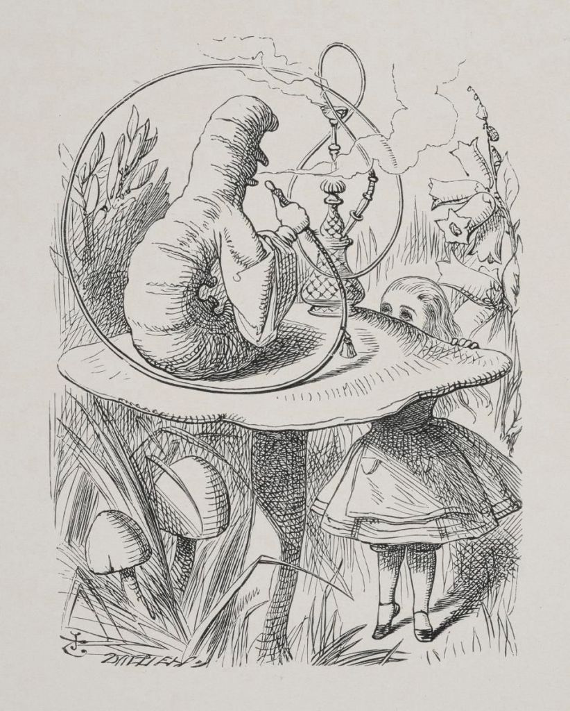 Carroll seems constantly to wonder why we accept eating or drinking anything we are told to eat or drink. Alice finds ingestable things constantly and only needs to be told to ingest them, like a magic mushroom by a caterpillar sitting on it smoking a hookah of opiates: