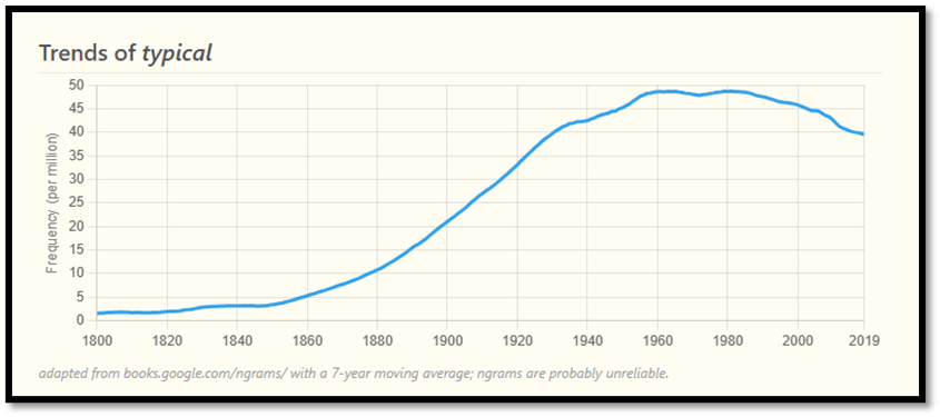 It appears that we have become obsessed by conformity to a type, as capitalism has strengthened its grip and established bourgeois order and its companion ideologies. However unreliable and invalid pointers toi firm conclusions ngrams are (and they are), in the example below the need for the word ‘typical’ has obviously become one we find it harder to do without than English speakers did in the first half of the nineteenth century, and that fits my experience of a small portion of the period pictured (1954 to the present):