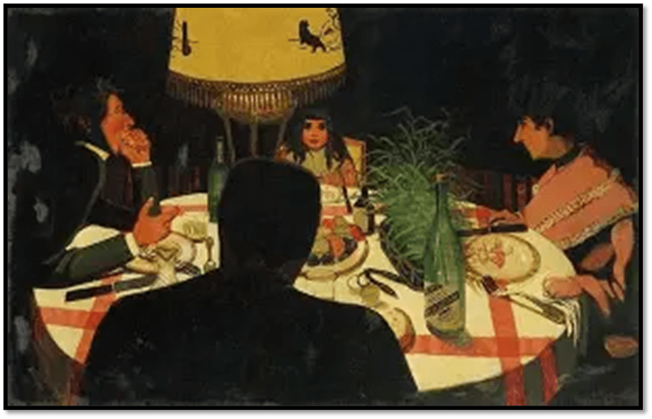 But radicals do not disappear without a trace. His Dinner by Lamplight, finished after his marriage, may predict the ‘typical evening’ in the Vallotton household but its protagonist’s presence is that of the same kind of black or darkened shadow that haunts his prints and feels threatening to a child who looks at that figure with hope, and perhaps a hint of fear: