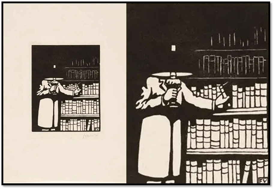 One of my favourite prints is Book Lover with Lamp in His Library (undated – see below). What cause disquiet here is that light that books might shed is all ‘owned’ by the male, who does not even share his face looking at them. What he does not light up, stays dark. Men hog the light: or at least that image of the man obsessed with the ownership of commodities – the collector. I check myself about this. I have to.