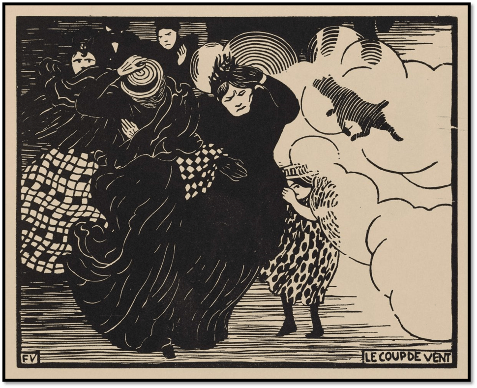 A coup in French is literally a ‘blow’ or ‘gust’ but, of course, we know it best in the term ‘Le Coup d’État‘, such as that event on 18 Brumaire where Napoleon took control of French revolutionary forces and thus the state. it has been forever after the term for a violent governmental takeover by force. Can a ‘coup de vent’ (gust of wind) have the same revolutionary change – for better or worse – as a Coup d’État? Certainly, even the first sort of coup can change a bourgeois family’s typical day. But this is a brilliant woodcut precisely because it shows just how much visible order can be disturbed and made to change in ways that seem to have their own logic in middle-class lives. It is not just that we have to hold onto our hats but our clothes themselves seem to have their own dynamism – and that dog barely visible beneath a gust that might be as solid, but no more, than smoke, could easily be imagined to fly rather than merely walk. It is as if time and space were disrupted not just the solid markers of our class position.