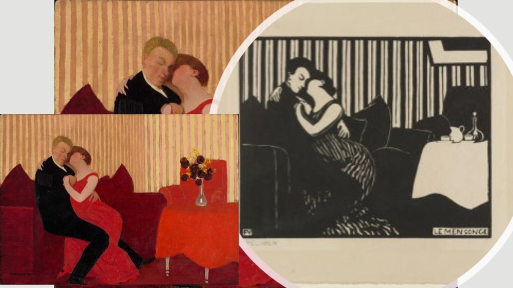 Even if Intimités are often focused on to the exclusion, as Glynn laments about himself, of the brilliant still lifes, landscapes and portraits, we should remember there was always a relationship between genres and media possible by hi. The first print of Intimités is Le Mensonge (The Lie) ut this exists as a painting as well and each has asoewhat different feel. The oil painting attempts a three dimensional room corner behind the lovers that changes ideas of depth and perspective in the painting, and the women’s striped dress is instead a red – in tonal variation with other red coverings in this almost-red room. The domestic tea things in the print are replaced by a vase of tall flowers in the painting. The hair colour of the lovers differs. Hence the lovers are not both so invaded by black colouring in the painting and are more differentiated. There is less sexual fusion in the painting too – in the print, the two flow into each other in the differentiating printer’s inks. I think this matters but I don’t know how. Sometimes you have to see the painting in the flesh to judge.