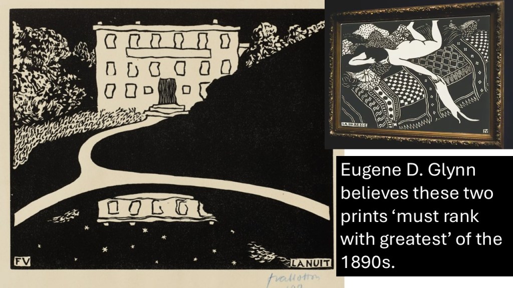 Glynn in two journal articles he wrote on Vallotton said that Vallotton’s prints (in these essays he notes his sorrow on confining himself just to the prints) that we know by the names La Paresse (Idleness) and La Nuit (The Night) ‘must rank with the greatest’ prints of the 1890s, a very fertile decade for fine wood-engraved prints.{3] The signed copy of La Nuit I picture I took from Christie’s sale catalogue online and is of Sendak’s own copy of the print, sold once both he and Glynn were dead. He is surely correct. La Nuit has the feel of a Gothic version of Van Gogh’s The Starry Night.
