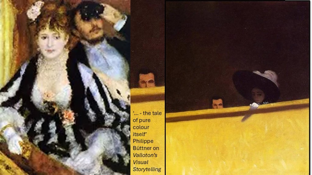 He does this by avoiding using light to entrap the deceptive appearance of the fine show made of costly appearances by this fashionable couple, betrayed only by the tearful eyes of Renoir’s gorgeous woman, aware of ‘her’ man seeking his next mistress-victim from surrounding theatre boxes. Instead the woman in Vallotton is shadowed not only under her hat but by her downward look int the floor of the ‘loge’ It all hides eyes that might betray even her vulnerability, to others (those outside the box – perhaps looking at them through opera glasses), whilst the man stares her out defiantly so that she knows his eyes are upon her but cannot return his gaze. As this silent drama occurs, Vallotton occupies his paint brush with capturing the variations of tone in the front wall of the theatre box, fronting the things it is shading within. The painting is a masterpiece, and thus, like Renoir, though it tells a story, it does so minimally such that it is, in the brilliant Philippe Büttner’s translated words, ‘the tale of pure colour itself’ we are told, wherein: