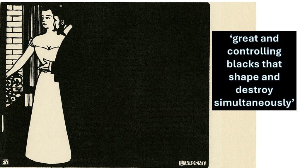 However, I am writing this now because on my last trip to London (see the blog here in proof) I bought at last an out-of-print book on Vallotton that was worth the reading: Ditta Amory & Ann Dumas [Ed.} (2019) Félix Vallotton, London, Royal Academy of Arts. This book rather overturns the myths of typicality around his life and work. For instance, it is commonplace in art history these days to lament that Vallotton’s antagonism to bourgeois ‘typical days’ was lost when he married into bourgeois wealth on 10 May 1899 to Gabriele Rodrigues – Henriques Even his most fervid psychoanalytic fan, Eugene D. Glynn, ‘husband’ (from before the title was possible) of Maurice Sendak, a Vallotton collector and great children’s storyteller – see my blog here – calls him ‘the radical disappeared into aesthetic research’.[1]