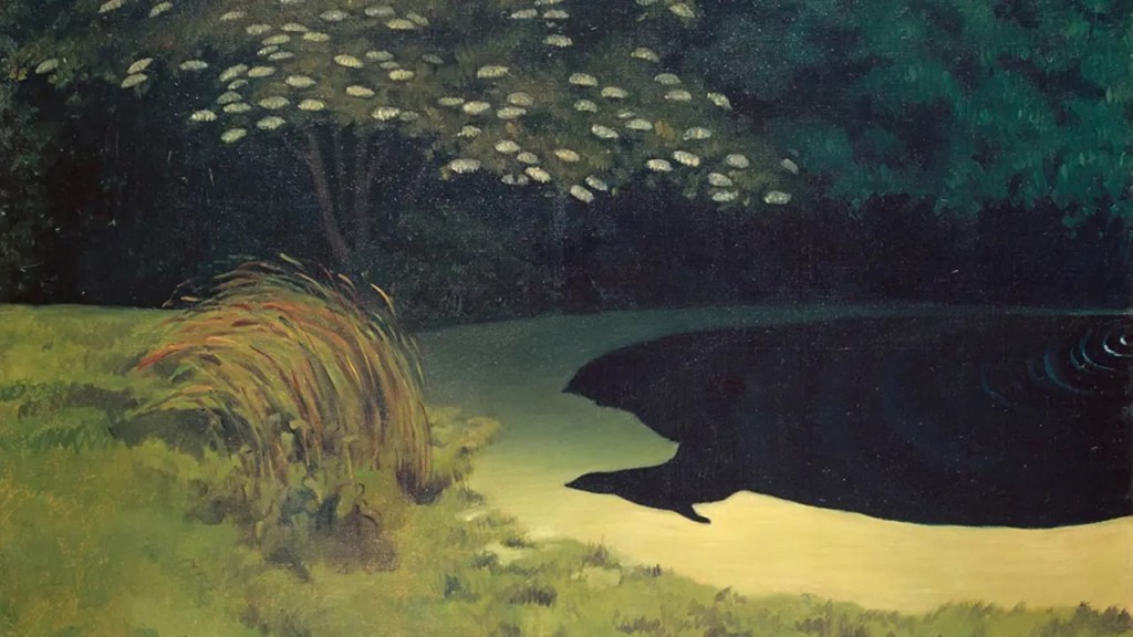 Perhaps Büttner is wrong: even when men play – or paint playfully as the latter says Vallotton does in La Loge de théâtre – men play with themselves and purely for their own gratification, so that even their melancholy is self-indulgent, as it is is in Malvolio in Twelfth Night. Hence there is little that is light even in a supposed midsummer night scene, such as The Last of the Rays or The Pond. See the latter below, of which Amory and Dumas say that: “An ominous darkness engulfs the water that creeps menacingly across the electric-green grass’. [6]
