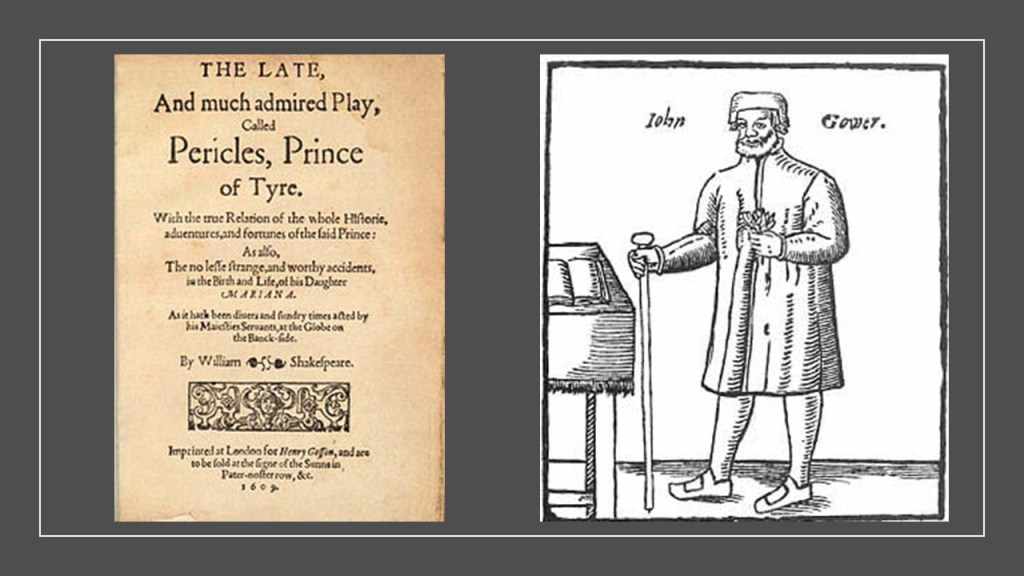 The idea is also in the lesser play, much as I love it personally more, Pericles, where the ‘chorus’ is now one man, but a known medieval poet – contemporary to Chaucer and another product of the Renaissance of courtly arts under Edward III – poet, John Gower. The Prologue to Act IV (lines 45 and following) mimics the ‘lame feet’ and the ‘rhyme’ of the latter’s narrative poetry, claiming the word ‘rhyme’ alone as the name of an archaic and lesser poetry. But again Gower is asking an audience that they indulge the lamed poet to help him ‘carry’ his characters (acting as avatar for Shakespeare himself), to use their own mental equipment to help carry burdens that he, being lame, cannot carry alone. The same plea is here to ‘imaginary puissance’ but not decked in such grandeur as the heroic content of Henry V, but popular tales of murder and rapine.