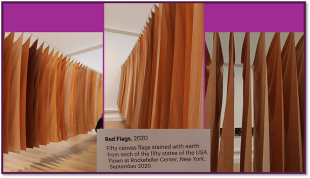 One work is extremely intriguing because it represents political contingencies that will vary named Red Flags. Lent to the exhibition by the Scott Mueller Collection, USA the flags once flew on standard flagpoles outside the Rockefeller Centre, used to housing the flags of differing nations, often ones in contingent conflict. The 50 flags were each stained with the natural ‘reds’ (that of course vary) in soils from each of the respective States of the union they represented. But ‘red flags’ are not neutral – try as they might to represent as Goldsworthy says to ‘transcend borders’ emphasising unity and ‘connection not division’, thee name is stuffed with association in American history and in the place, in it of the creation of an internal ‘Red Meance’ to cement the federated nation’s current fragile contentions over the meaning of land. Whose land is this? Is still a dividing thing in American – the colour Red also associated with the insulting name by which Native Americans were once known, ‘Red Indians’, where skin colour is a mark of double displacement – these are not even ‘Brown Indians’.