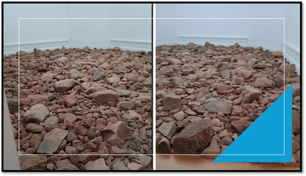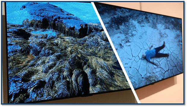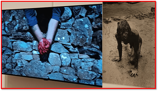The fragilityof the materials in a structure or in some of its parts is vital to some works – one video shows the boot of the artist progressing over a fragile surface of ice, fracturing it, and there are many versions of this kind of ‘accidental’ exploitation of fragility to create pattern that might temporarily be experienced as beautiful – till the whole surface structure melts thus broken up and at risk to heat that destroys it. But some human structures depend on fractures in materials – and even are moulded by such fractures. If you place that next to a hand covered in redding material – almost certainly natural, then the violence of the appeal of fracture becomes associated. See the video (stilled) on the left in the collage below. The effect is of a discovered murder.