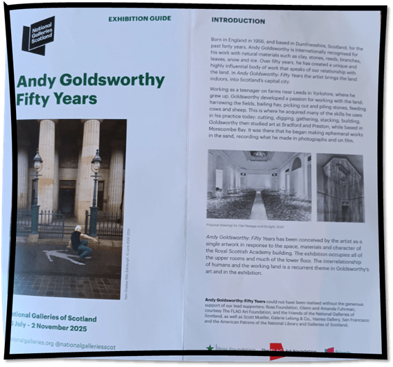 It is almost compulsory to describe the effect of art as achieved ‘beauty’. We use ‘beauty’ too often in this respect. The words that come to me as I reflect on an attempt to reconnect with the art of Andy Goldsworthy are precarity, structural fragmentation or decay, fragility and ephemerality, so how has his lasted and strengthened its hold on us over 50 years: This blog is based on a visit to the National Galleries of Scotland’s exhibition Andy Goldsworthy: Fifty Years at the Royal Academy Scotland on the 11th August 2025 at 11 a.m.