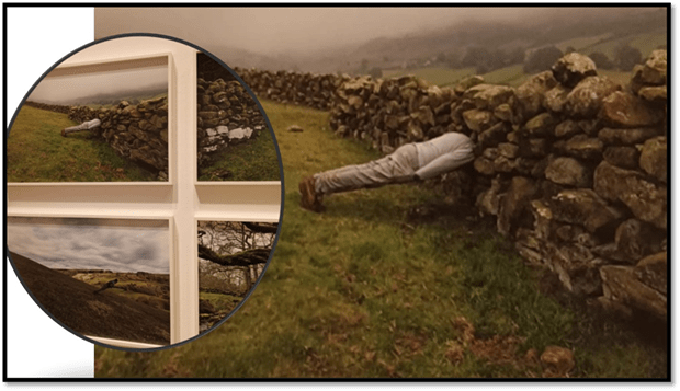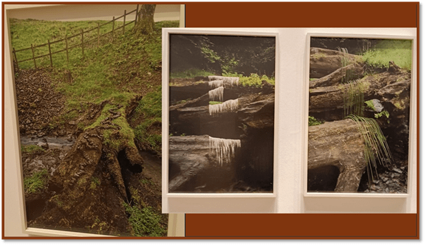 I don’t know how to show how these effects arise in each of the recorded instances (of art long since decayed back into its landscape setting) except that the item down at the left of the second collage above that might be either an intentional bridge to a beck or a tree fallen over that beck and worn and decayed, or have been cut and shaped (perhaps to act as a bridge or by an artist looking for other effect) has the look of a severed hand grasping the soil – even digging into the earth (perhaps to save itself. The fallen trees over a gully are strewn with threads might represent water flow, Nothing in our interpretations has structural or evidential weight, can breakdown – is interpretively precarious. A shape or prints can seem to be marks crossing such structures but are they, or accidental damage or fungal growth.