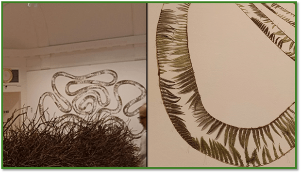 Those end pieces are the nearest approach to beauty in the place, and even over-reach that word. At one end is a patterned drawn line, perhaps of an organism – a tapeworm might be suggested but also a kind of intervolved passage to a nowhere but staying within itself, from which there is no escape. Within its borders. as we get close, we see it decorated with green-brown fern (the colour suggesting decay, but also the life of the parasite I imagine.