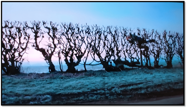 Sometime PRECARITY is an aspect of the artist’s self-placement in the art. In that video record, for instance of him making the art by crawling slowly, in order to maintain precarious balance, across ranges of hedgerows outside the time of foliation, so that they structure provide empty spaces of passage of his body, if, at least, he was careful, and enough rudimentary structure to bear his weight.