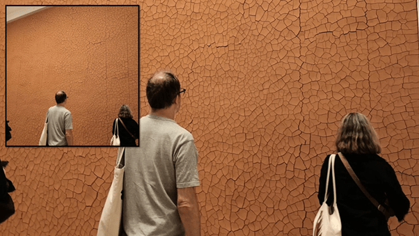 Yet the interaction of things on earth over time, let alone the interaction – accidental or planned of human and raw material causes changing patterns of flow, direction of obstruction touched by that flow and causing it to move. The film on the left is of the ebb and flow of the sea on coastal sea foliage causing difference in the flow potentials for the sea as it itself moves the stronger foliage to a different position. In a ‘live’ new piece called Red Wall (2025) red earth from the Lowther Hills the earth, refined of rock material, is applied as a surface to a wall, drying variably and in relation to its variations of thickness and cracking – sometimes regularly, sometimes not. The interaction that causes marks is indirect to the agencies which make the art, but it reveals precarities in longer cracks that appear to be about to shift the material from the wall.