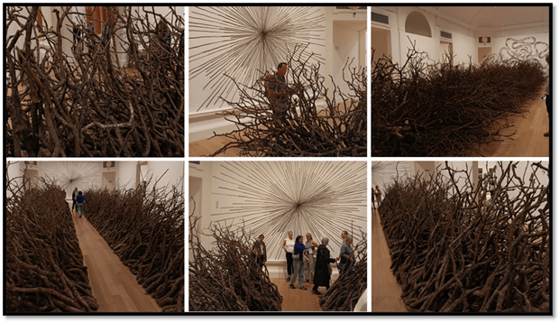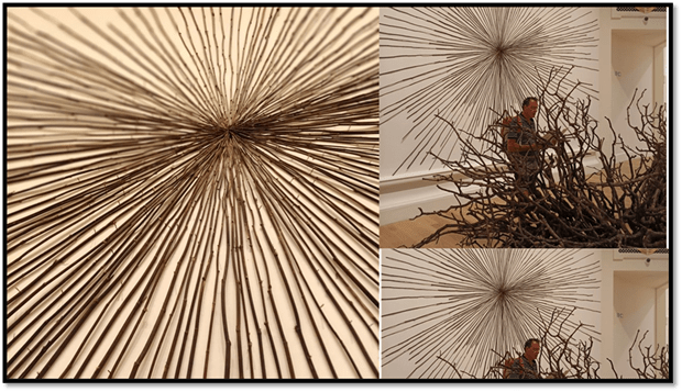 On the other wall, more wind blown twigs are formed into an irregular concentricity that reminds of the Sheep Paintings we see at the entrance.