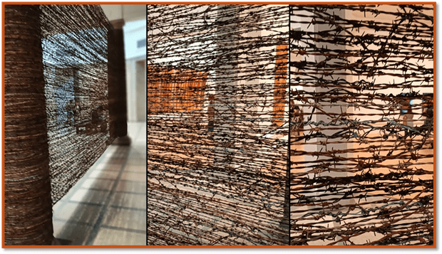 I don’t think ‘beauty’ covers all this at all. Let’s take a work that still fascinates me in memory: Fence (2025). Goldsworthy associates the barbed wire out of which Fence is fashioned with the aggression over the limitation of land to ownership: the barbs might claim to be weapons to discourage sheep from escaping, they often are mounted against the entry of persons to a ‘land’ they too might feel entitlement to if not ownership. Conceptually it is spot on. It is the one work, paradoxically, I found ‘beautiful’, if fearsome. The aggressive nature of the barb is even greater than that landlords achieve, in its use of ‘beautiful’ crossovers.