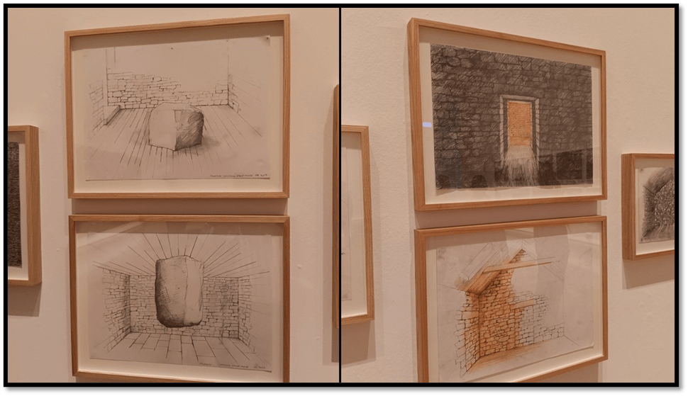 Drawing, of course, is a medium we often associate with beauty, and though often the method of temporal ‘studies’ for a larger work, as were those for a project based on the rescue of buildings in Hanging Stones Lane and Hanging Stones Farm, near Rosedale Abbey in North Yorkshire, they associate with the temporal nature of human presence in the area – whose remnants are shaped and placed materials and marks like paths and access points like door. These drawing play with durability however that cannot or never existed, that claim to defy ephemerality whilst emphasising stolid resistance to human presence.