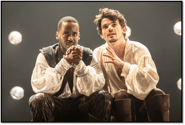 But take those beruffed gentleman out of the picture and put in their place, as avatars, two young actors with raunchy reputations and you see already the potential for giving the encounter between them a sexual as well as an aesthetic aspect. Forget Marlowe’s supposed statement: ‘All they that love not tobacco and boys are fools’, a remark attributed to Marlowe from the testimony of Richard Baines, a government informer, in 1593, and just see the lithe and sexy figure of Ncuti Gatwa in that role to Richard Bluemel’s Shakespeare.